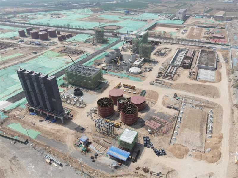 煤氣凈化區(qū)域的鼓風機站、蒸氨框架、脫氨廠房土建結(jié)構已經(jīng)封頂,循環(huán)水泵房以及集水池已經(jīng)完成澆筑,油庫區(qū)、焦油氨水分離區(qū)域的罐體逐步封頂,初冷器設備安裝完成,脫硫、終冷洗苯以及電捕等主要設備的安裝以及埋地管道的施工已在進行中。