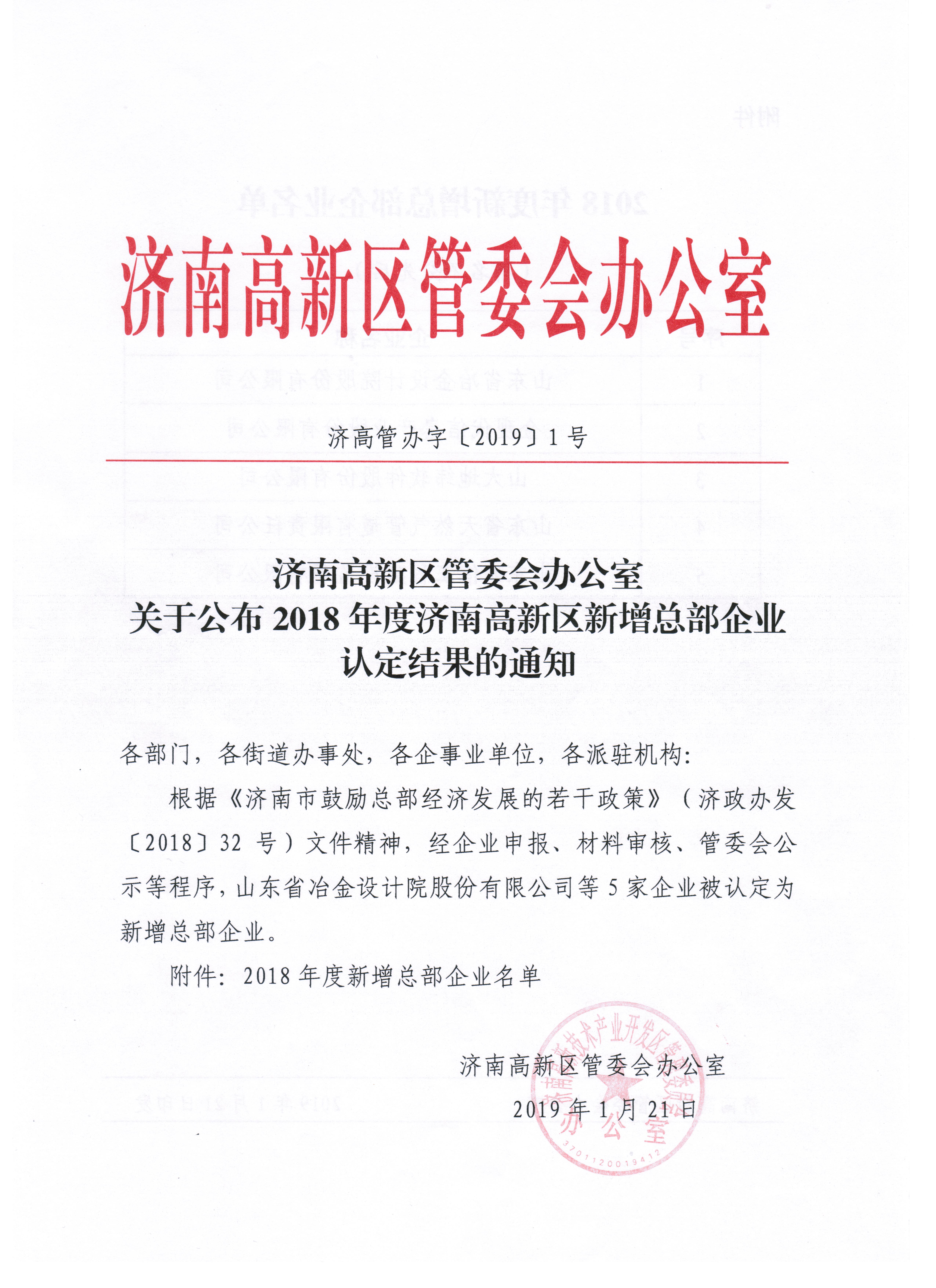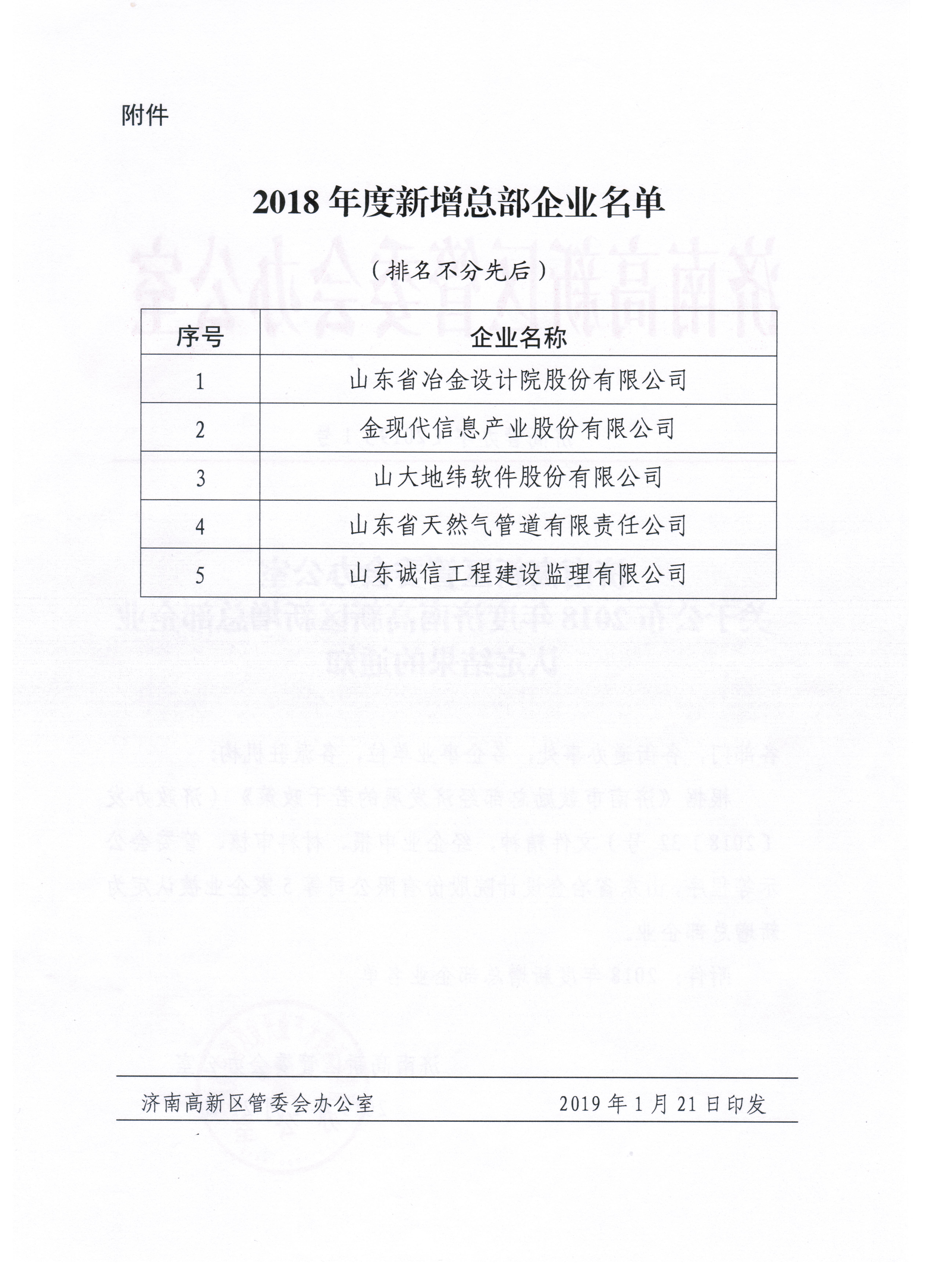 近日,山東省冶金設(shè)計院股份有限公司被濟南市認定為首批“總部企業(yè)”。這標志著我公司的綜合實力以及對地方發(fā)展的貢獻得到了濟南市政府的高度認可。