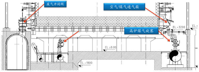 廢氣開閉器及煙道布置在焦?fàn)t焦側(cè),混合煤氣及空氣導(dǎo)入裝置布置在焦?fàn)t機側(cè),便于調(diào)節(jié)從機側(cè)到焦側(cè)各立火道煤氣流和空氣流,且便于廢氣流的排出,有利于焦?fàn)t長向加熱的均勻性。